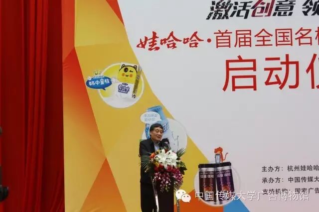 中国传媒大学广告学院丁俊杰教授致辞说,社会未来的5年是什么样的,就看现在的大学生是如何培养的。此次大赛跟娃哈哈气质相迎,不断开拓和创新,着眼与现实和未来,为学生提供了良好的发展平台。